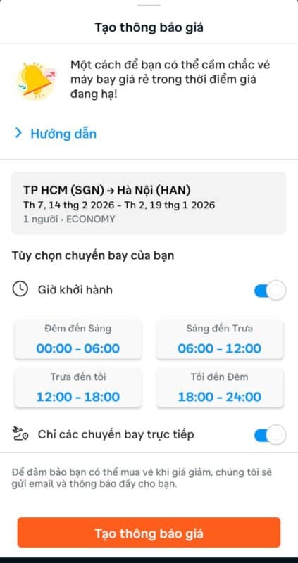 Một sai lầm thường gặp là đặt vé ngay khi vừa tìm thấy mà không theo dõi thêm biến động giá. Thực tế, giá vé có thể thay đổi theo ngày, thậm chí theo từng khung giờ. Traveloka hỗ trợ tính năng thông báo giá. Khi kích hoạt, bạn sẽ nhận được thông báo ngay khi vé SUN PhuQuoc Airways giảm xuống mức mong muốn. Cách này đặc biệt phù hợp với những người chưa cần đặt vé gấp nhưng vẫn muốn mua được giá tốt.